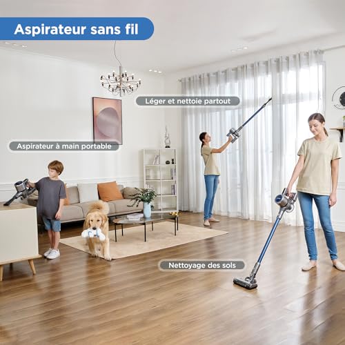 Aspirateur sans fil 5-en-1 Eureka AK10 Pet 🌟 : dotée d’un moteur BLDC 450W, une puissance d’aspiration de 26KPa et une autonomie de 60 min 🔋. Léger, silencieux, avec filtration HEPA 🌀 pour un nettoyage en profondeur et un écran LED intuitif. Idéal pour sols et poils d’animaux 🐾.
