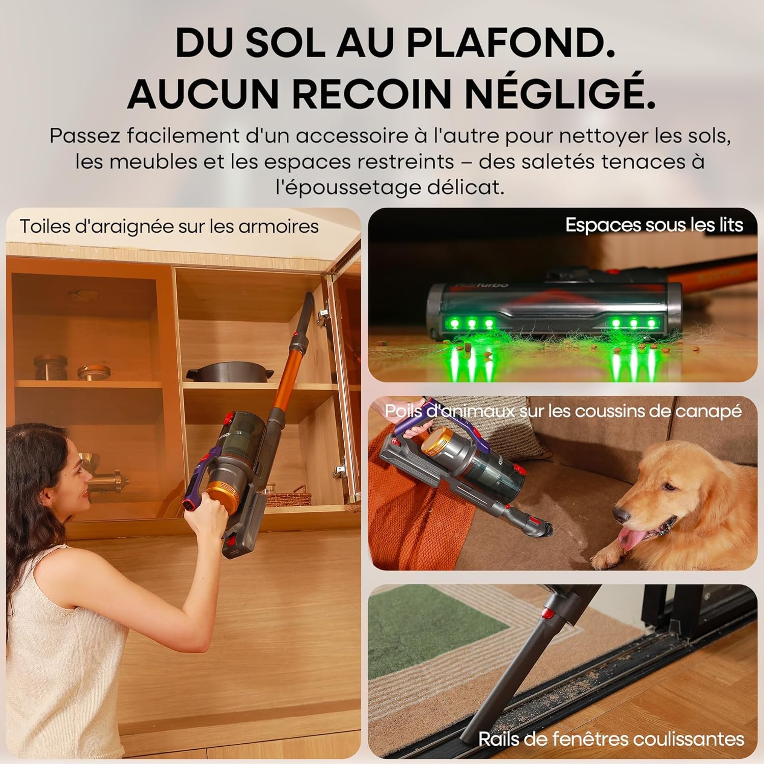 - Éclairage LED : aide à repérer la poussière dans les zones sombres.